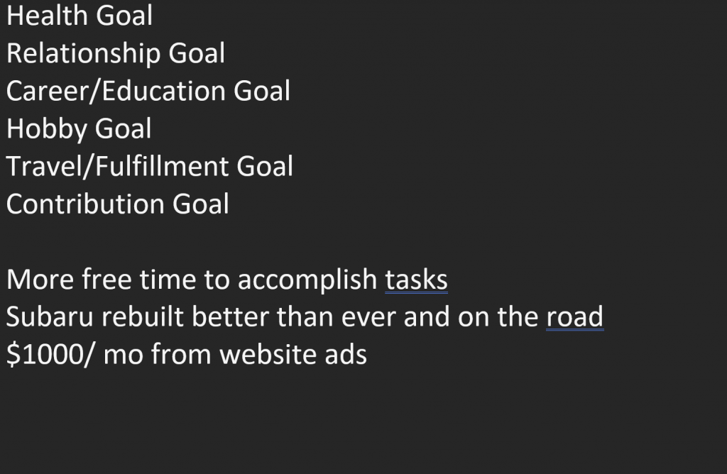 - Education goals – learning a new skill, completing a degree or certification, or studying for self-improvement.