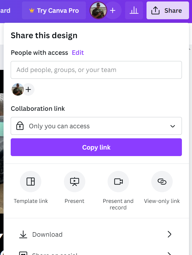 - Once you’re satisfied with how the vision board looks, click the “Share” button in the upper-right corner of the screen, then click the download button. Now you have the image saved to your computer or phone and can use the display properties to add that as your background.