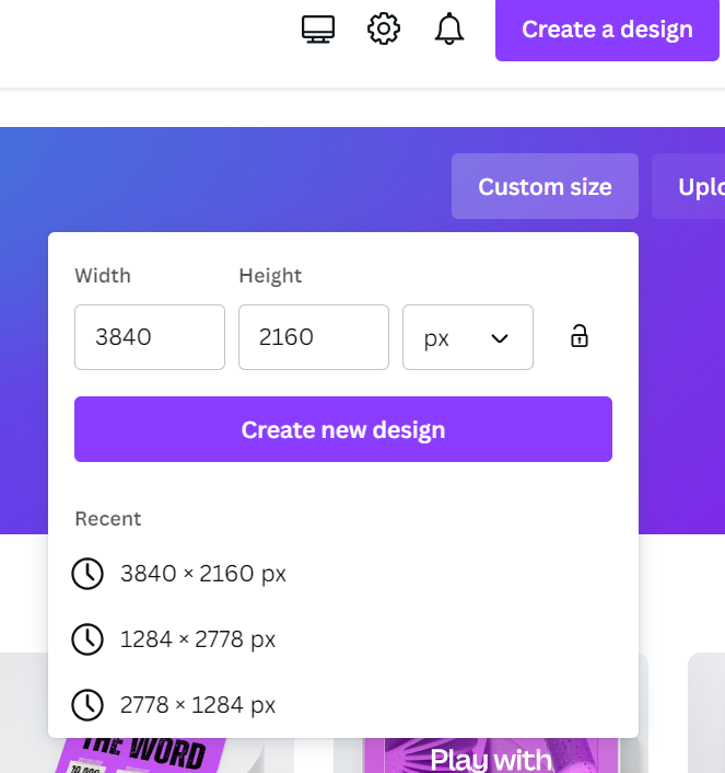 - Next you want to choose the size of your design. They have a bunch of pre-made sizes already in the list. However, I have an iPhone 13 Pro Max and a 4K computer monitor, so I decided to use the “Custom size” button and create the exact size I wanted. Tip: you can Google your phone resolution to get the correct size for your design if you don’t know it.